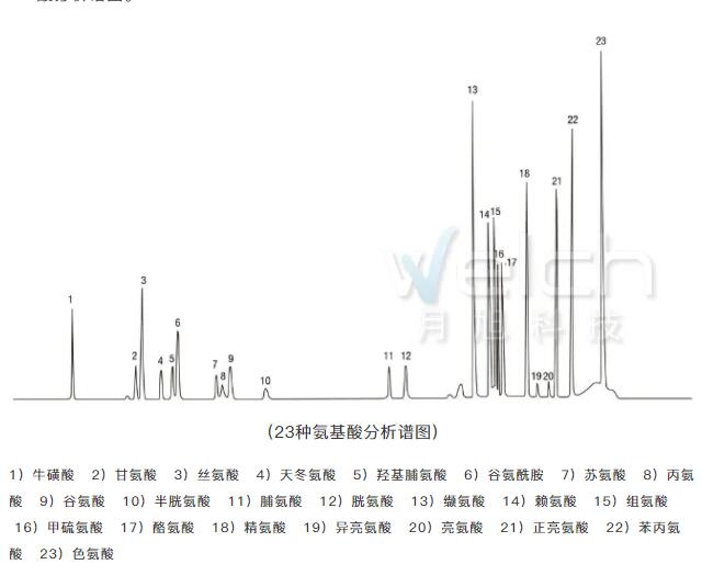 使用月旭Ultimate? Amino Acid Plus氨基酸檢測(cè)專(zhuān)用柱可以分離未衍生的氨基酸,同時(shí)月旭 ELSD-5450蒸發(fā)光散射檢測(cè)器的檢測(cè)是基于物質(zhì)的散射光信號(hào),所以即使沒(méi)有紫外吸收,無(wú)需衍生也可以檢測(cè)到氨基酸。例如,下圖中23種氨基酸分析譜圖。