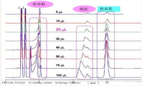 常規(guī)情況下,為了保證峰形,我們的進(jìn)樣體積都控制在5-20μL,盡量不要超過(guò)25μL。如果不能做到減少至合適的進(jìn)樣體積,為了得到較好的峰形,應(yīng)盡量選擇與流動(dòng)相比例相同或接近的溶劑。