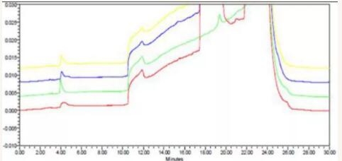 (流動(dòng)相為pH 3.0緩沖鹽。綠色譜圖為對(duì)照品,另外三個(gè)譜圖樣品的溶劑從下至上分別為0.1%磷酸、純化水、pH 3.0流動(dòng)相)