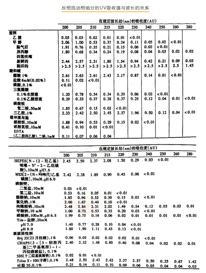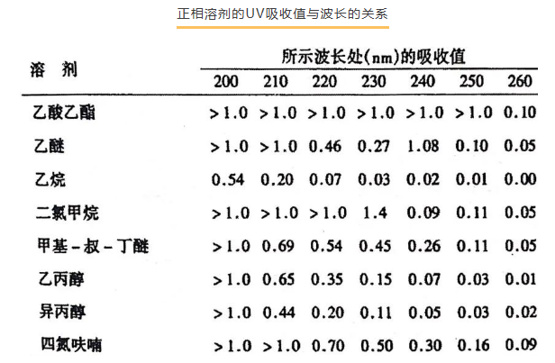 5、流動(dòng)相組分的紫外本底吸收。此項(xiàng)考慮涉及到溶劑的種類選擇、流動(dòng)相pH選擇以及流動(dòng)相緩沖鹽選擇等。有些酸有紫外本底,如甲酸,乙酸;有些沒(méi)有,如磷酸。這樣,在使用較低波長(zhǎng)檢測(cè)的方法時(shí),就要考慮使用紫外本底小的酸。冰醋酸在短波長(zhǎng)檢測(cè)下應(yīng)該慎用。水在180nm以上實(shí)際無(wú)吸收,可忽略其影響。正相色譜所用溶劑的吸收度通常更強(qiáng),所以一般需在長(zhǎng)波長(zhǎng)檢測(cè)。