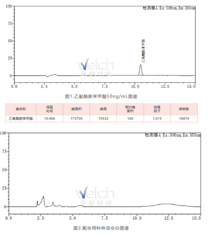 04、色譜條件● 色譜柱:月旭UItimate? XB-C18,4.6×250mm,5μm。 流動(dòng)相:乙腈水溶液; 流速:1.0mL/min; 柱溫:30℃; 進(jìn)樣量:10μL; 波長(zhǎng):激發(fā)波長(zhǎng)306nm,發(fā)射波長(zhǎng)350nm。