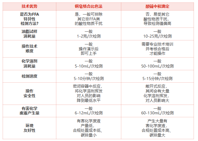 相較于酸價(jià)傳統(tǒng)的酸堿中和滴定檢測(cè)方法,銅皂絡(luò)合比色法主要的技術(shù)優(yōu)勢(shì)見(jiàn)下表: